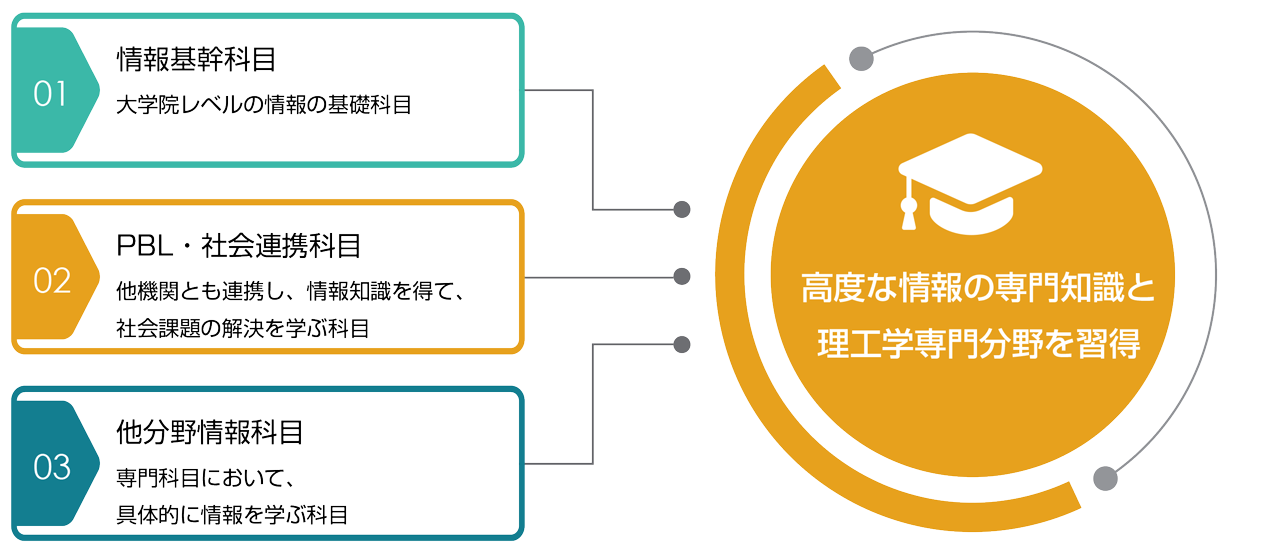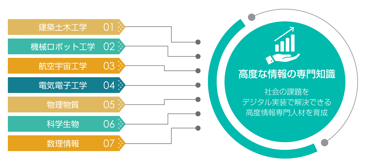 また、本コースでは、情報を架け橋に、専門分野の枠を越えたカリキュラムが用意されています。大学院入学までに培った理工学専門分野の知識を土台に、情報・デジタル分野の専門的な技術や知識を身に付け、これからの情報化社会を導くことのできる高度情報系人材を養成します。
