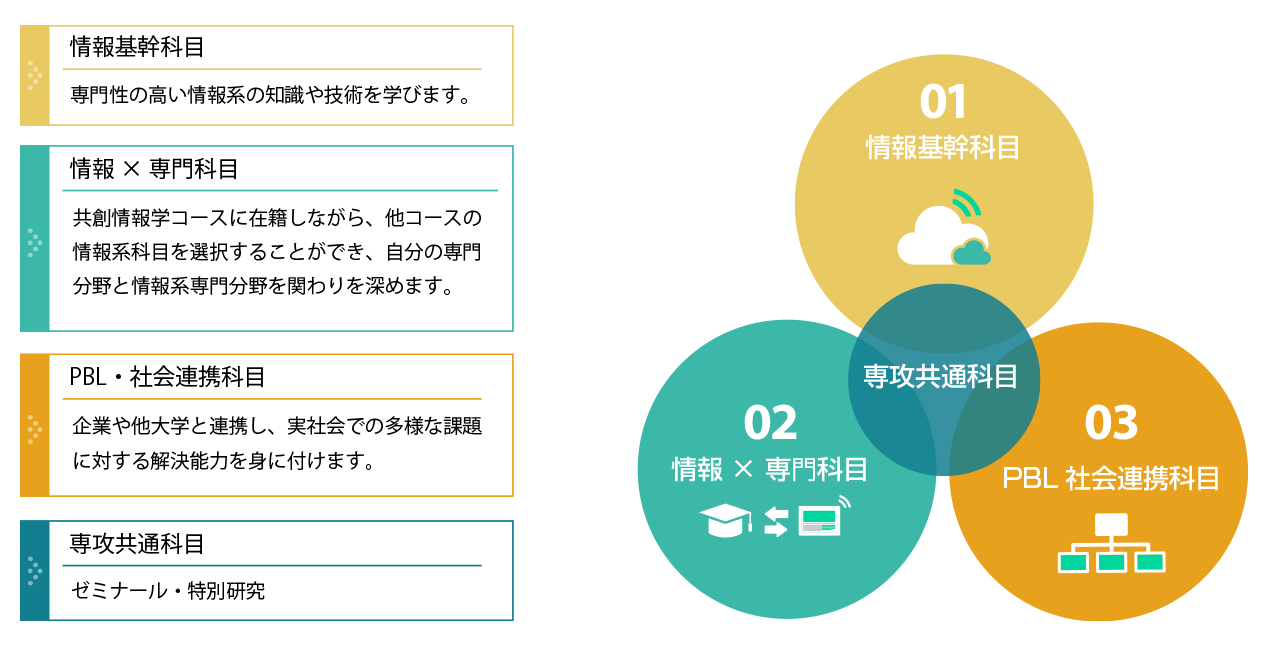 共創情報学コースでは、「情報×専門」の視点から企業や地域と連携した科目や、オンライン学習プラットフォームを用いた先駆的な科目など、特色のある科目を設けています。