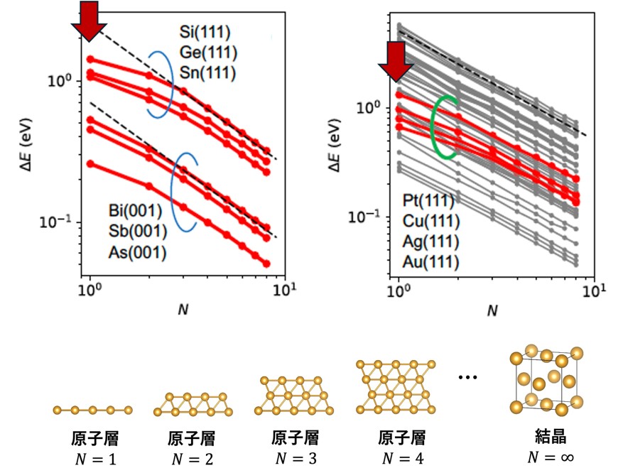 多くの2次元物質は層状物質の剥離型であり、「van der Waals (vdW)型2次元物質」と呼ばれる。一方、ダイヤモンド構造を持つシリコンや面心立方構造を持つ鉛や金などの非層状物質に対しても原子層が合成されており、「非vdW型2次元物質(非層状物質の原子層)」と呼ばれている。本研究では、非vdW型2次元物質を高精度に予測する「薄膜余剰エネルギー計算法」を世界に先駆けて開発した。非vdW型2次元物質の網羅探索を実行し、グラフェンやMoS2の性能を超える新たな2次元材料を予測する。