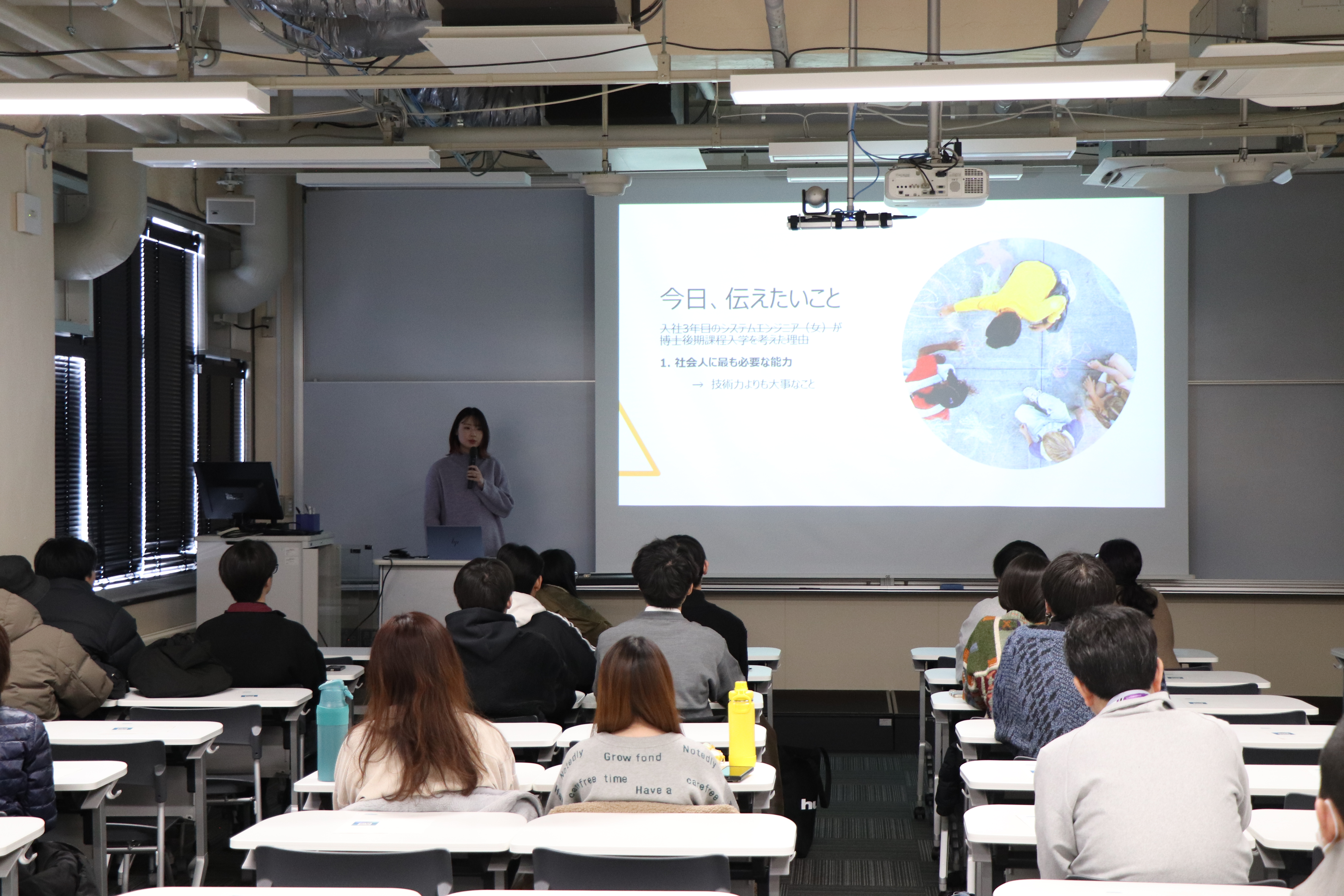 アンケートの感想では、「4月から社会人だが、相手の求めていることを掴むことを意識して、活躍できるエンジニアになりたいと感じた。」「未来を見据えて行動することを無意識に当たり前としていたことに気づかされたことが、今回参加して良かったと感じました。」等の感想が寄せられ、今後のキャリア形成を考える機会となりました。
