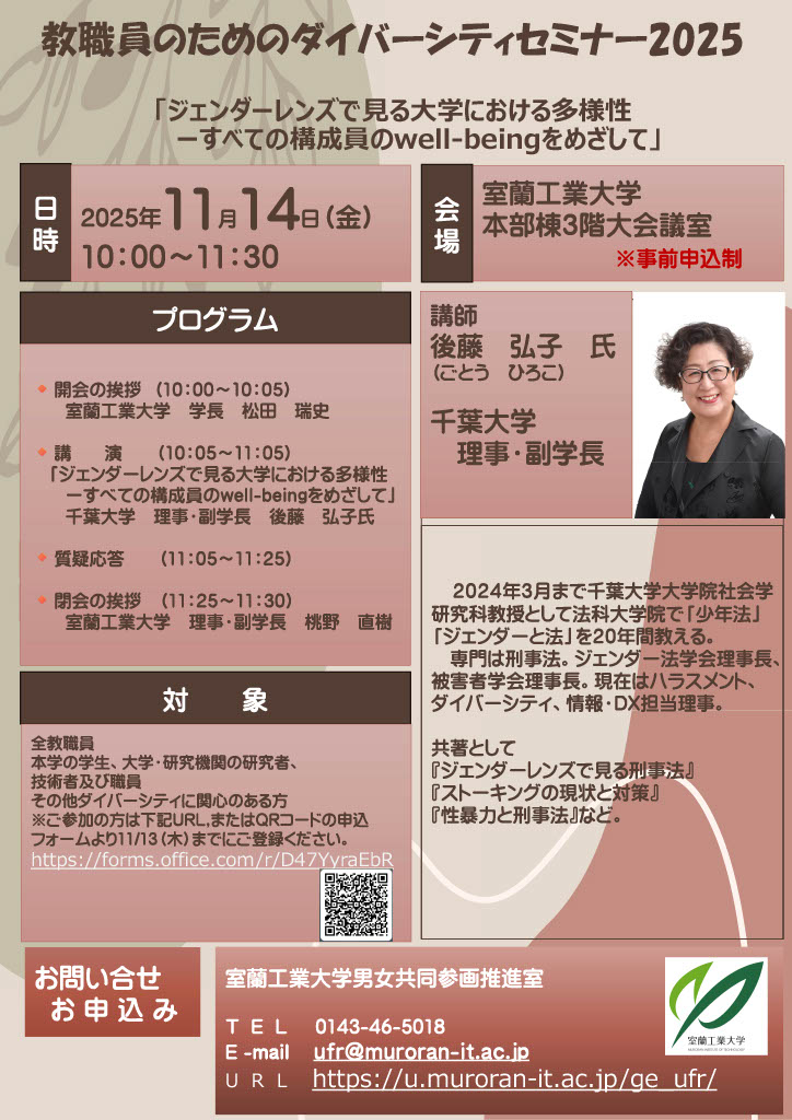 講師には千葉大学 理事・副学長 後藤 弘子様に「ジェンダーレンズで見る大学における多様性ーすべての構成員のwell-beingをめざして」について講演いただきます。