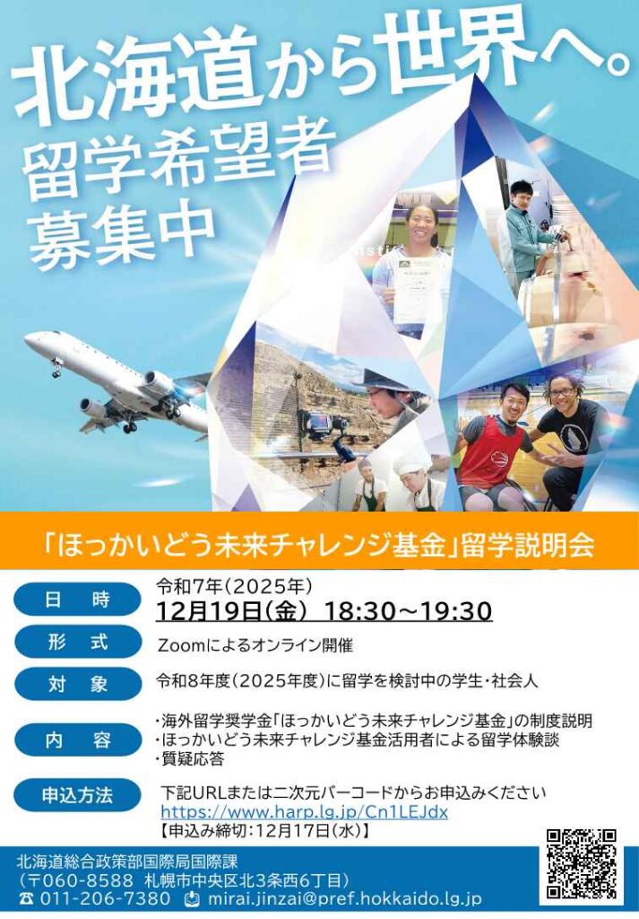 「ほっかいどう未来チャレンジ基金」留学説明会(12/19)の開催について