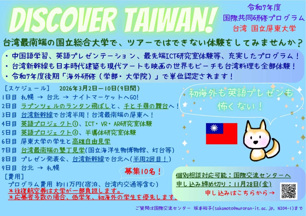研修費用:約10万円(宿泊、台湾内交通費等含む)