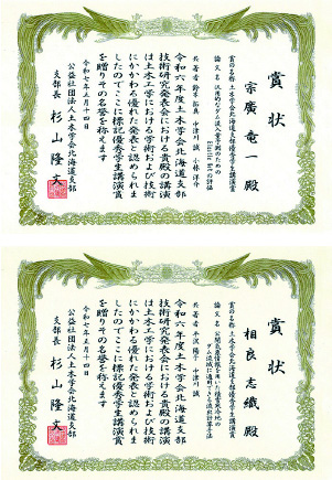 令和5年度土木学会北海道支部技術研究発表会で,社会人DCの平沢陽子君(タイトル;積雪寒冷地の任意地点に適用可能な通年流出計算手法の提案)が「土木学会北海道支部奨励賞」を,2024年3月(2023年度)学部卒業生の西村康克君(タイトル;ゲームエンジンを用いた河川空間デザインへのデジタルツインの活用に関する検討)が「優秀学生講演賞」を受賞しました。おめでとうございます。
