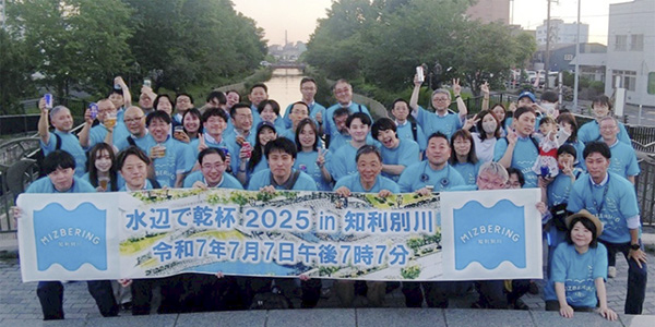 室蘭市・知利別川でミズベリング(水辺で乾杯)が開催されました。7月7日午後7時7分に水辺で乾杯という全国イベントです。この日は室蘭でも珍しく30度を超え,行政,民間,NPO,そして学生の約50名が集結しました。河川を管理する北海道室蘭建設管理部ほか関係者のご尽力のおかげで人数が増えて益々盛り上がってきています。